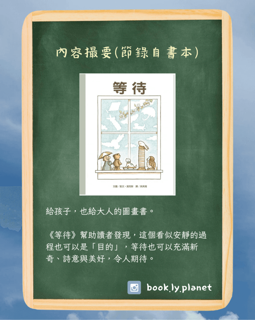 去年在二手書市集中,朋友遞上她的戰利品給我看看,視線隨即被這本《等待》的純白色窗框吸引著。今年再到市集,原本都是想看看大家捐贈出來的繪本,找找有沒有心頭好。誰知這個窗框再次在我面前出現,最後它成為了我書櫃的一員。