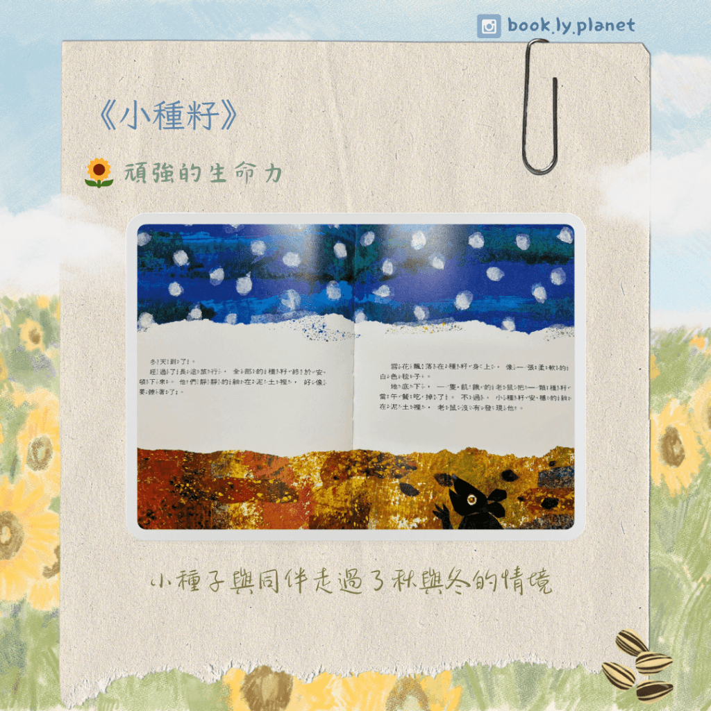 四季各有其美麗之處—而種子一直也在經歷其中!它們於天空中隨風飄揚,期待能找到一個落腳點。小種子們走過熾熱的太陽、高高的雪山、藍藍的海洋、乾旱的沙漠等地,途中也有追不上其他種子的時候,但它一如既往地向前飛,欣賞著大自然的美麗。看著種子們感受著四季與不同地方的氣息,也讓我在想:「我會比較想體驗哪一個地方的天氣?」、「如果真的很熱的話,大概我也像其中一些種子一樣,未能生存了(?)」