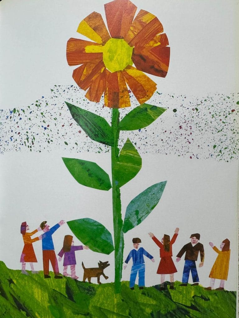 後來小種子成功落地發芽—長出比屋子高的花兒,更令人們、太陽、其他昆蟲一一前來欣賞這朵綻放的花。看到人們為花兒送上暖暖的祝福時,自己也不期然流下淚來,感受到生命的美好之處。