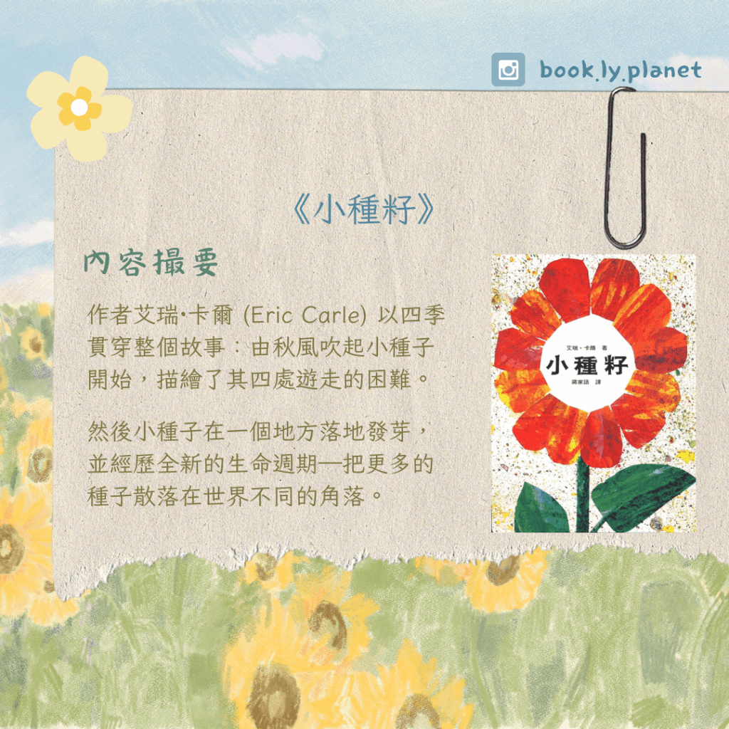 這位作者繪畫動物主題的作品相對上比植物多,當我在準備課業時看到《小種籽》的封面—幾乎完全被花朵佔據的畫面,就決定要看看他如何描寫有關植物的故事。🌿
