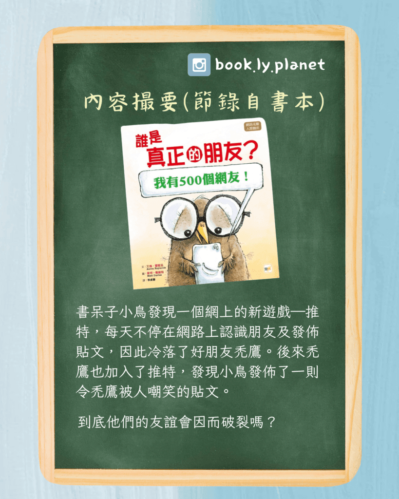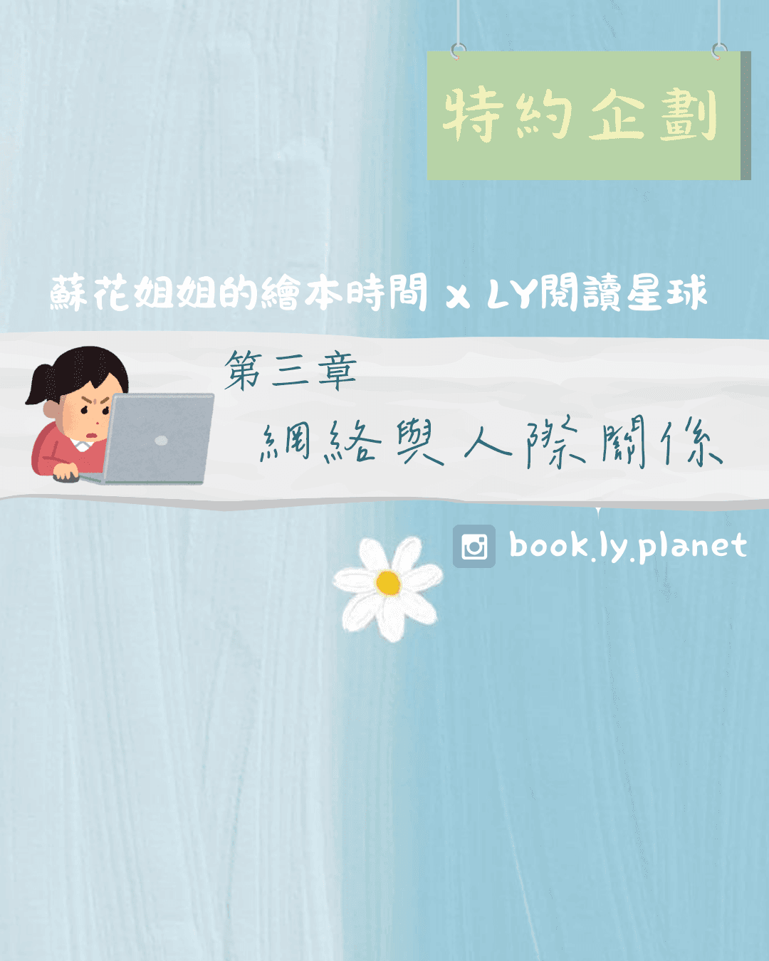 故事中的主角書呆子小鳥喜歡上網,起初主要是玩遊戲,後來發現到社交媒體「推特」成為了他生活的一大樂趣。於是蘇花姐姐也從中作出不同的提問,藉以了解小學生使用網絡及社交媒體上的習慣,讓他們分享自己上網的常到網站。當學生們看到小鳥上網的神情時,也好像看到自己的影子。此時我也會想:作者畫上戴眼鏡的小鳥,或許想突顯他用很多時間上網的特徵吧!