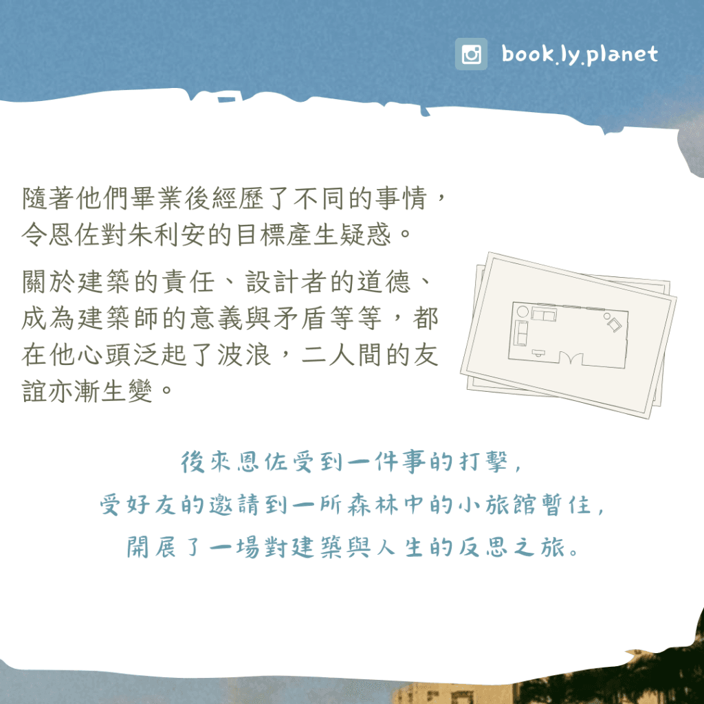 香港是一個國際大都市,許多外國遊客都會慕名而來去觀賞香港的建築,例如中上環的商業大廈、商店之間的招牌與霓虹燈,還有集中西文化於一身的建築物。每座建築物落成的背後,也經歷不同的工序,才會化身為現今的模樣。到底建築師策劃的過程中,會從甚麼層面去考慮?或許這本小說會讓我們有更多答案。